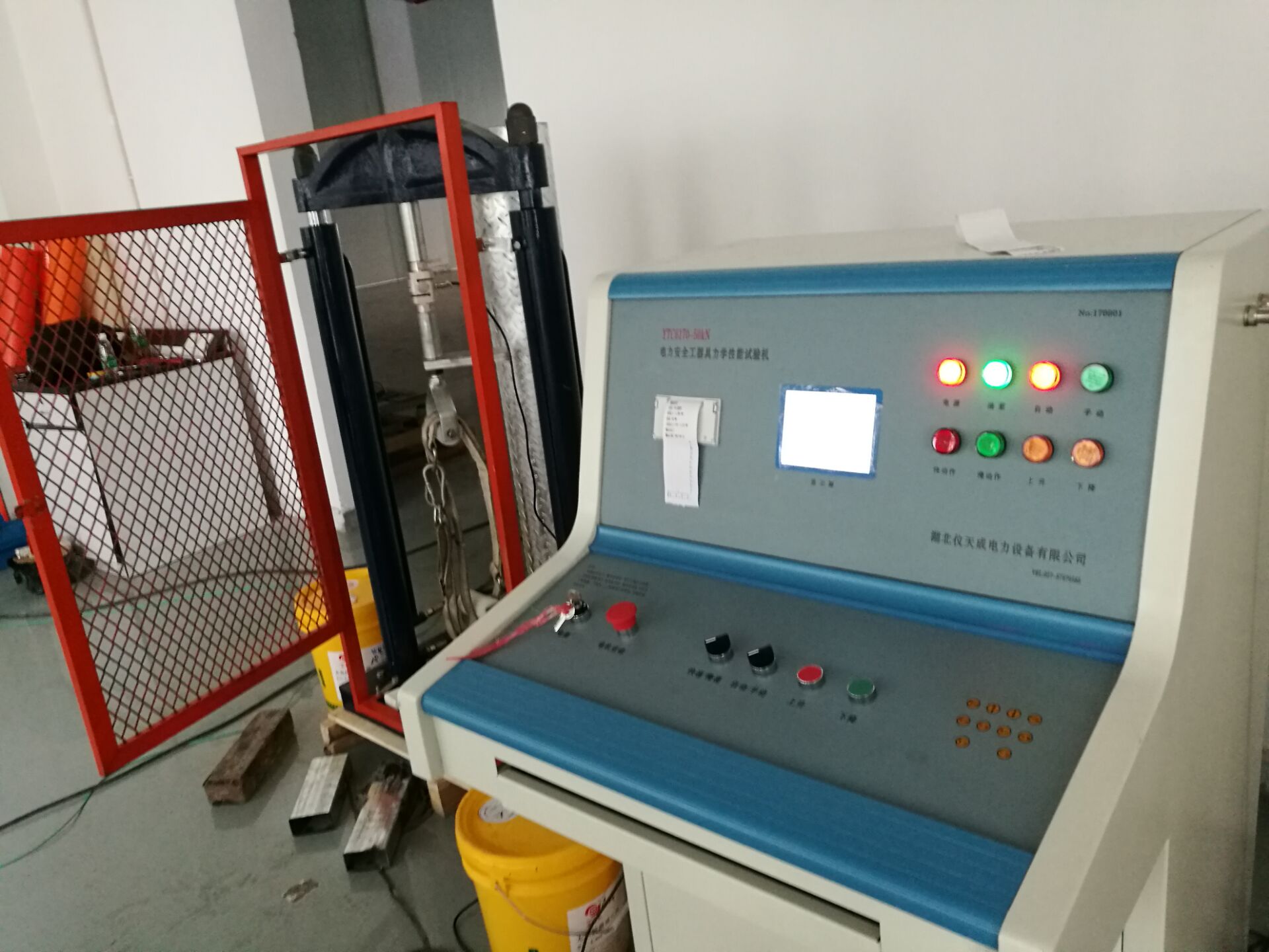 此次培訓(xùn)的重點設(shè)備是YTC6170電力安全工具器具力學(xué)性能測試機,我公司研制的電子測力機(電力安全工器具力學(xué)性能試驗機),符合國家電力公司《電力安全工器具預(yù)防性試驗規(guī)程》要求,按《規(guī)程》完成各種預(yù)防性力學(xué)性能試驗。本機由測試顯示和加力設(shè)備兩部分組成(如需測安全帽配安全帽試驗臺) 測試顯示部分由拉壓力傳感器、控制鍵盤、液晶顯示屏、微型打印機、手動按扭等組成。鍵盤使用薄膜輕觸鍵,使用手感好,液晶顯示為中文菜單式,操作人員可根據(jù)被試對象選擇相應(yīng)名稱菜單,當(dāng)需要對測試結(jié)果打印時,可打印測試報告,便于備案檢查。本機設(shè)置兩個傳感器接口,傳感器3KN、100KN傳感器為測試安全工具之用。安全帽測試為測試安全帽專用。兩只傳感器既可單獨使用,也可同時使用。能滿足不同使用場所環(huán)境的要求和工作要求,性能穩(wěn)定,測試結(jié)果準(zhǔn)確。