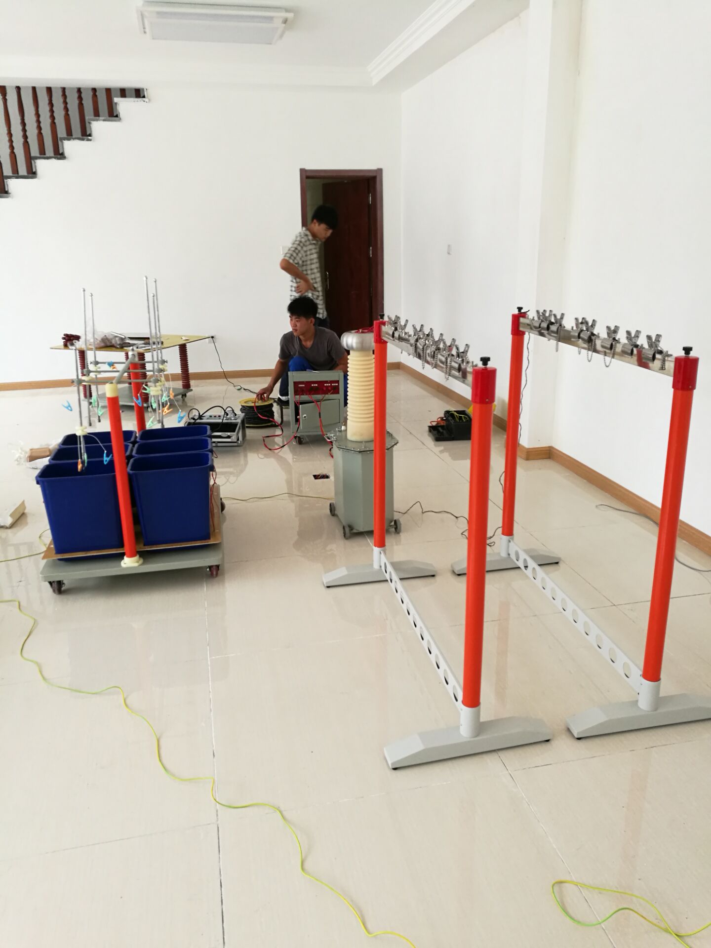 此次培訓的設備和內(nèi)容很多,其中培訓的主要設備是YTC1103 絕緣靴(手套)耐壓試驗裝置。李工首先對設備的原理和功能進行了全面而細致的講解。我公司的該設備比較先進,測試速度快,提高了工作效率;耐壓、高壓泄漏電流直讀,還可自動識別不合格試品,智能化程度高;可同時測試4雙絕緣靴(手套),并可讀取每只的泄漏電流,準確判斷不合格的絕緣靴(手套);底部裝配腳輪,可隨意移動。非常方便。