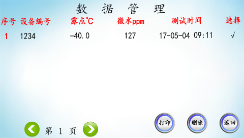 點(diǎn)擊“返回”,儀器返回到“功能選擇”。在“功能選擇”界面選擇“數(shù)據(jù)管理”,進(jìn)入“數(shù)據(jù)查看”界面,如下圖所示。可以在此界面查看以前保存的數(shù)據(jù)。